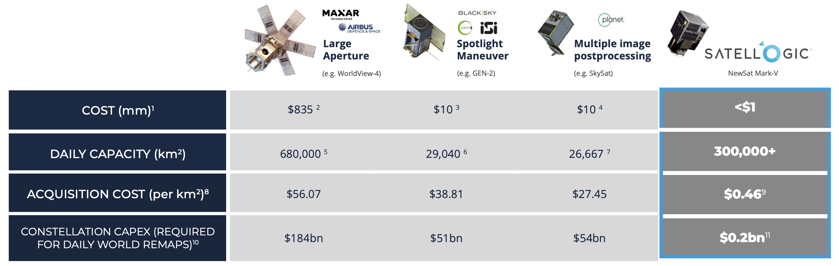 One of the companies I’m watching is Satellogic, who claims to have got the costs of data acquisition down to $0.46 per km2 — two orders of magnitude cheaper than their competition: